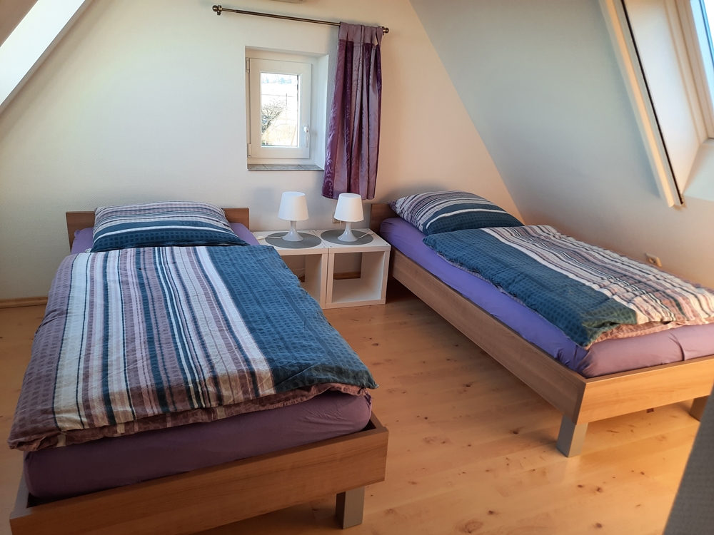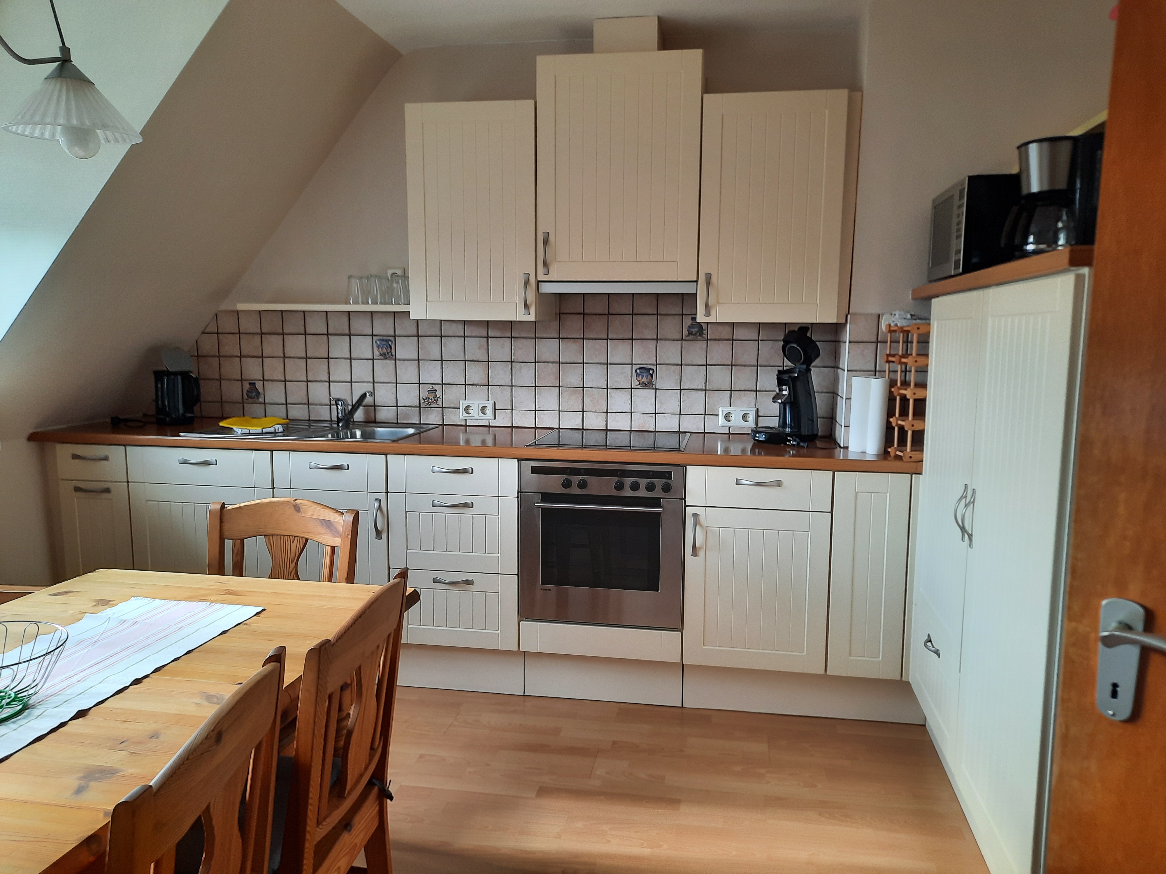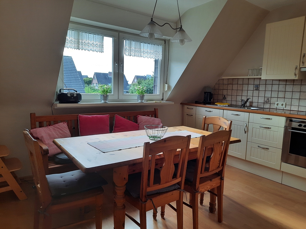 Die überdachte Sitzecke lädt zum Verweilen ein. Fahrradfahrer können Ihre Fahrräder sicher bei uns unterstellen. Die Wohnung befindet sich im 1. Obergeschoss bzw. Dachgeschoss mit einem separaten Eingang. Die Küche mit der gemütlichen Sitzecke ist voll ausgestattet mit Spülmaschine, Backofen, Mikrowelle, Kaffeemaschine sowie Padmaschine usw.. Das Wohnzimmer mit Sat- Fernseher bietet viel Platz. WLAN ist vorhanden. Bad mit Dusche/ WC. Das 1. Schlafzimmer mit Doppelbett befindet sich im Obergeschoss . Das 2. und 3. mit jeweils 2 Einzelbetten und einer Klimaanlage im Dachgeschoss ( Durchgangszimmer ).