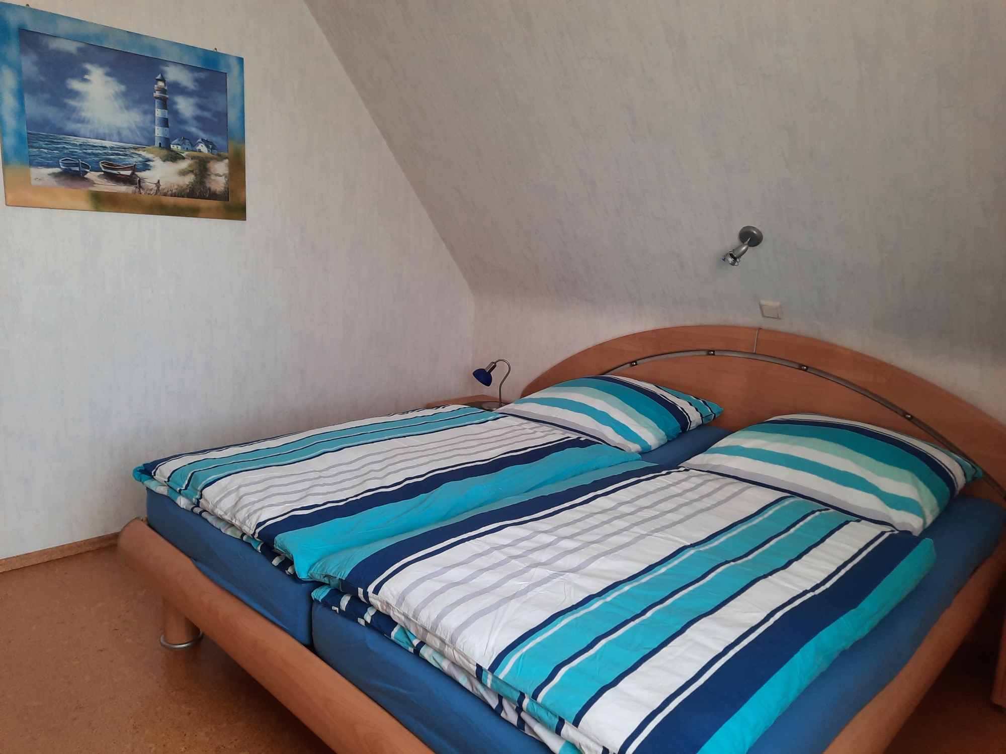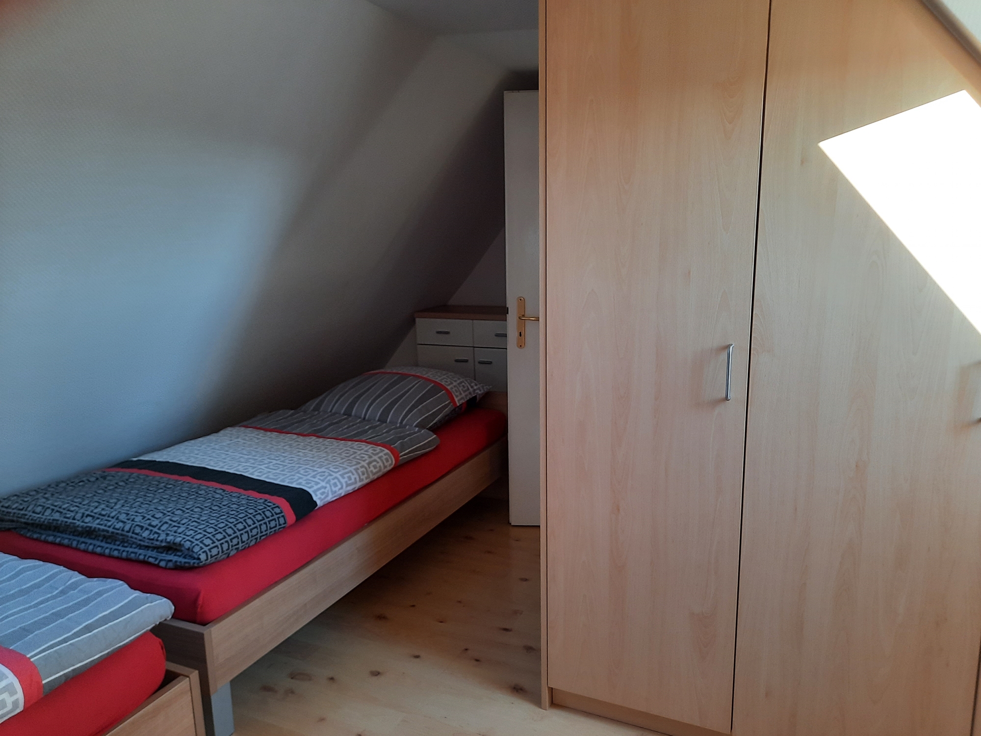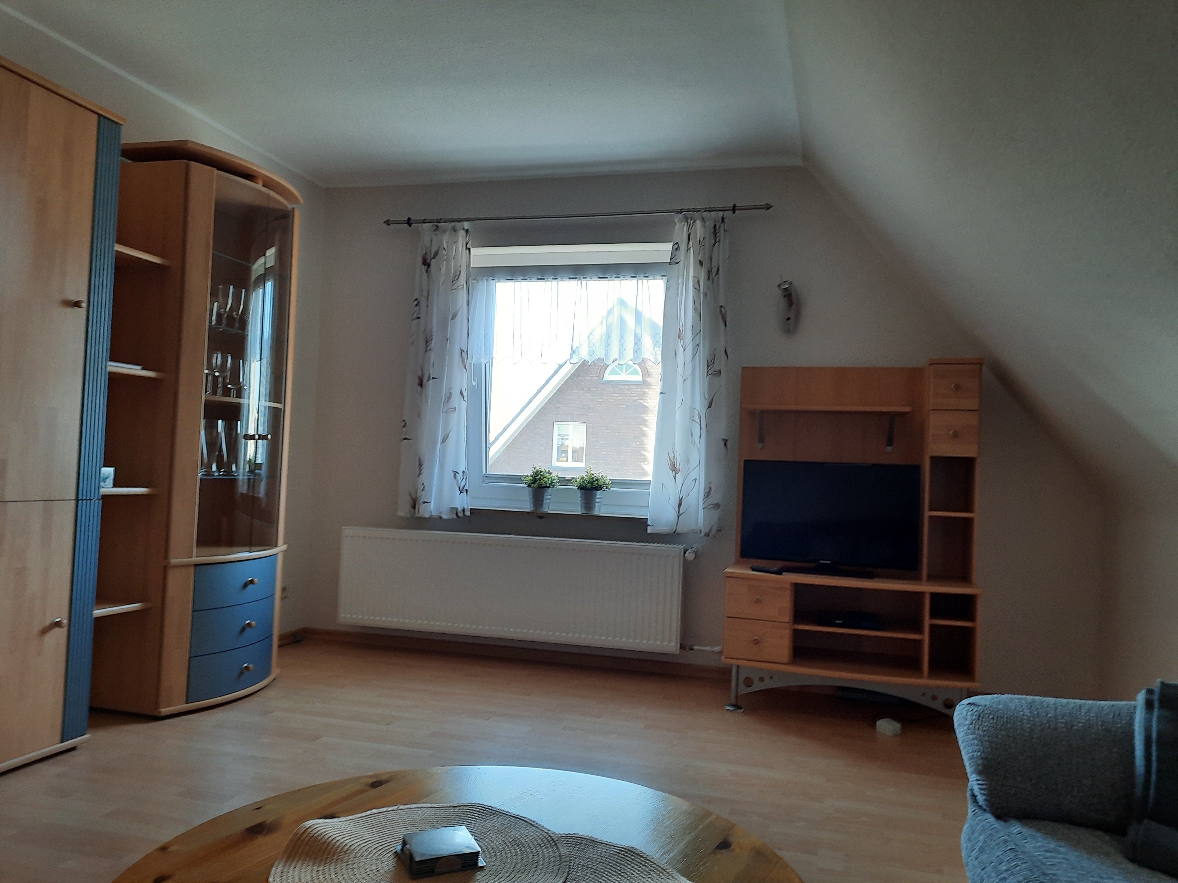 Die überdachte Sitzecke lädt zum Verweilen ein. Fahrradfahrer können Ihre Fahrräder sicher bei uns unterstellen. Die Wohnung befindet sich im 1. Obergeschoss bzw. Dachgeschoss mit einem separaten Eingang. Die Küche mit der gemütlichen Sitzecke ist voll ausgestattet mit Spülmaschine, Backofen, Mikrowelle, Kaffeemaschine sowie Padmaschine usw.. Das Wohnzimmer mit Sat- Fernseher bietet viel Platz. WLAN ist vorhanden. Bad mit Dusche/ WC. Das 1. Schlafzimmer mit Doppelbett befindet sich im Obergeschoss . Das 2. und 3. mit jeweils 2 Einzelbetten und einer Klimaanlage im Dachgeschoss ( Durchgangszimmer ).